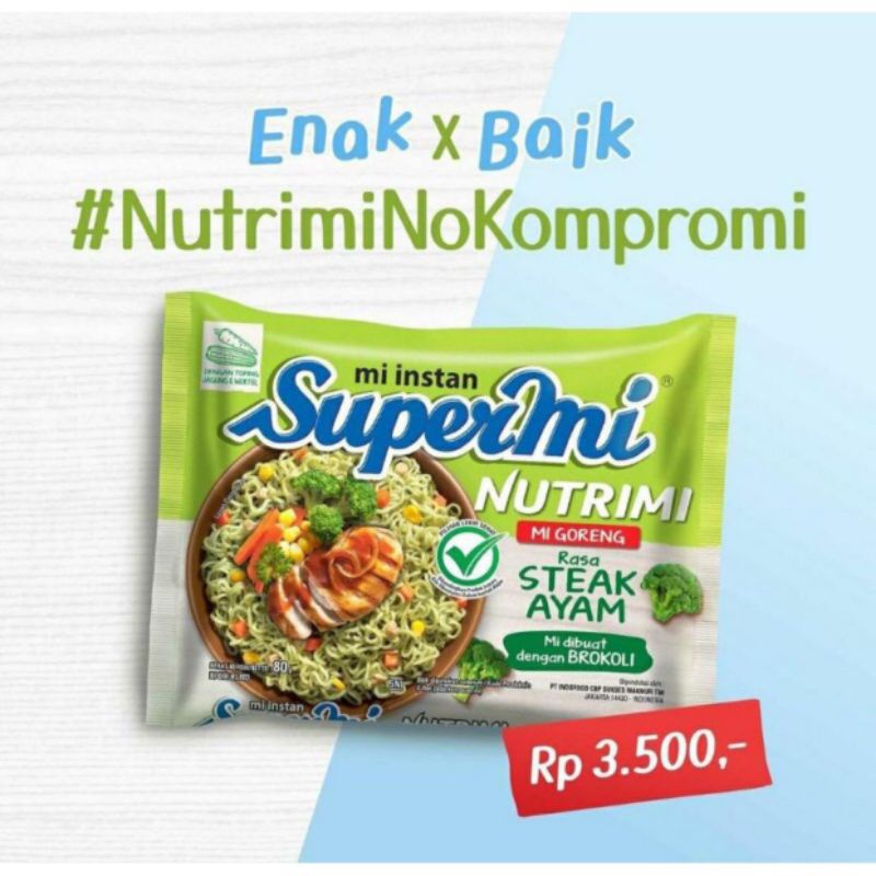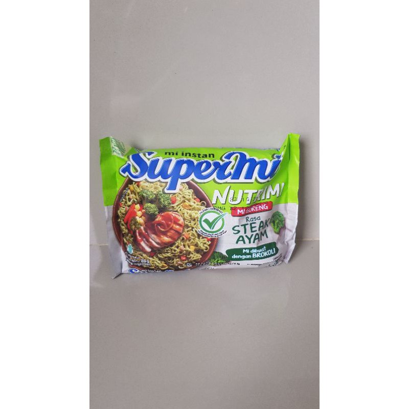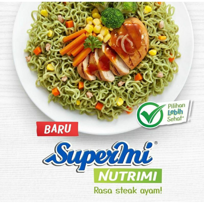 Rasa steak ayam yang nikmat dibuat tanpa pengawet dan penguat rasa. Supermie supermi nutrimi steak ayam. Supermi nutrimi merupakan mie goreng yang dibuat dengan brokoli, dilengkapi wortel dan jagung dengan rasa steak ayam dalam kemasan. Diluncurkan pada tahun 1968 oleh pt limasatu sankyo industri pangan sebagai mi instan serbaguna, lalu pada tahun 1976 supermi hadir dengan rasa kaldu ayam. Rasa steak ayam yang nikmat dibuat tanpa pengawet dan penguat rasa.